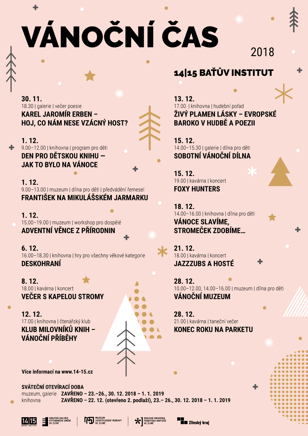 V muzeu, galerii i knihovně jsou připraveny besedy a nejrůznější tvořivé dílny pro děti i dospělé. Sváteční atmosféru navodí výstavy v muzeu a koncerty zlínských kapel v kavárně. Přijďte se vánočně naladit do 14|15 BAŤOVA INSTITUTU.